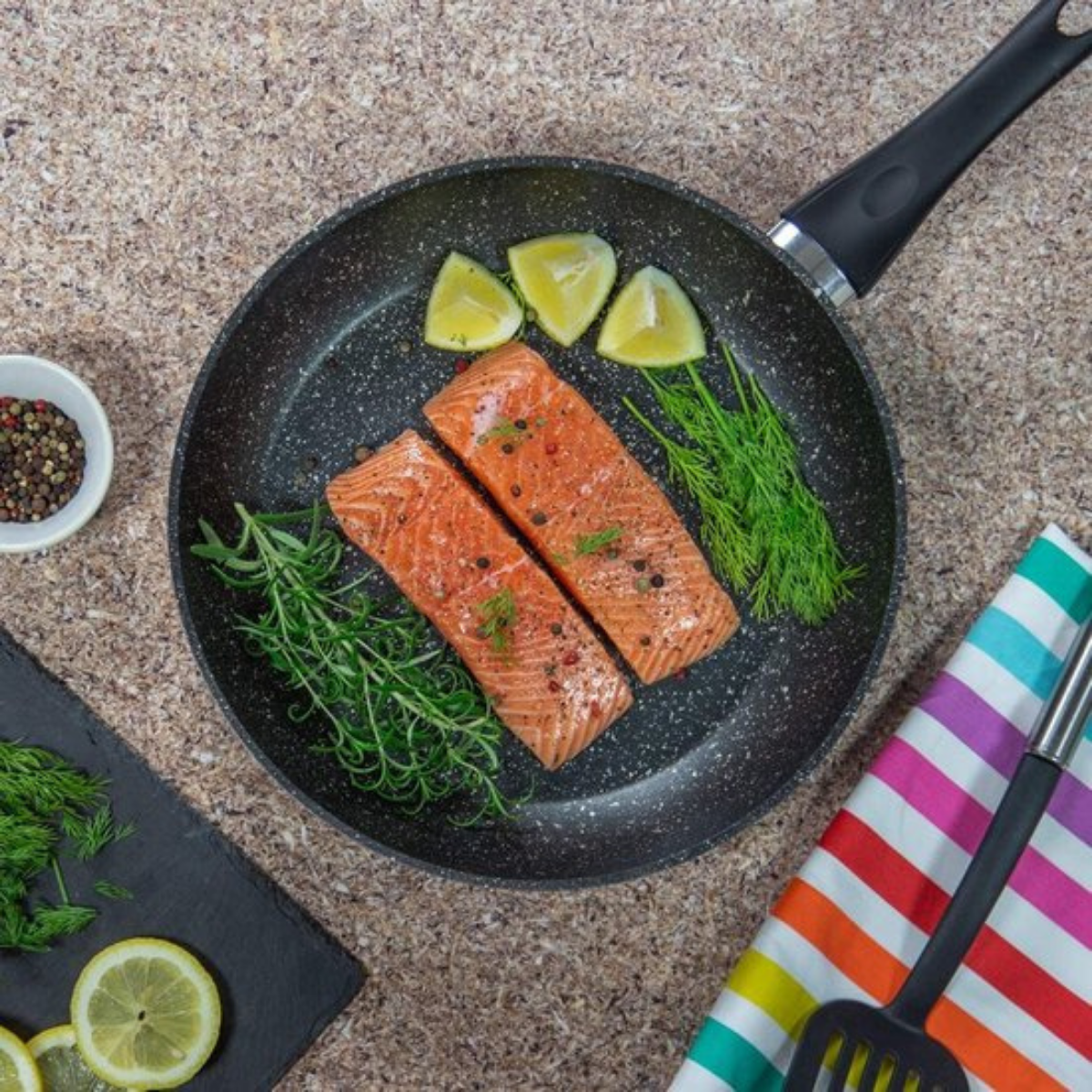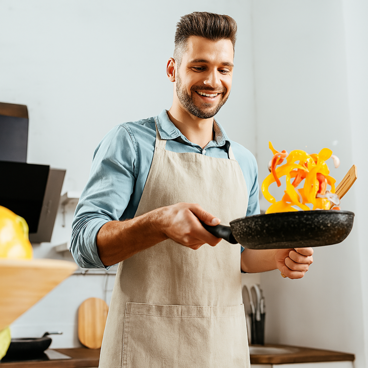 Onze pannen gebruiken tot 90% minder olie. Voor extra smaak mag je natuurlijk altijd wat toevoegen.