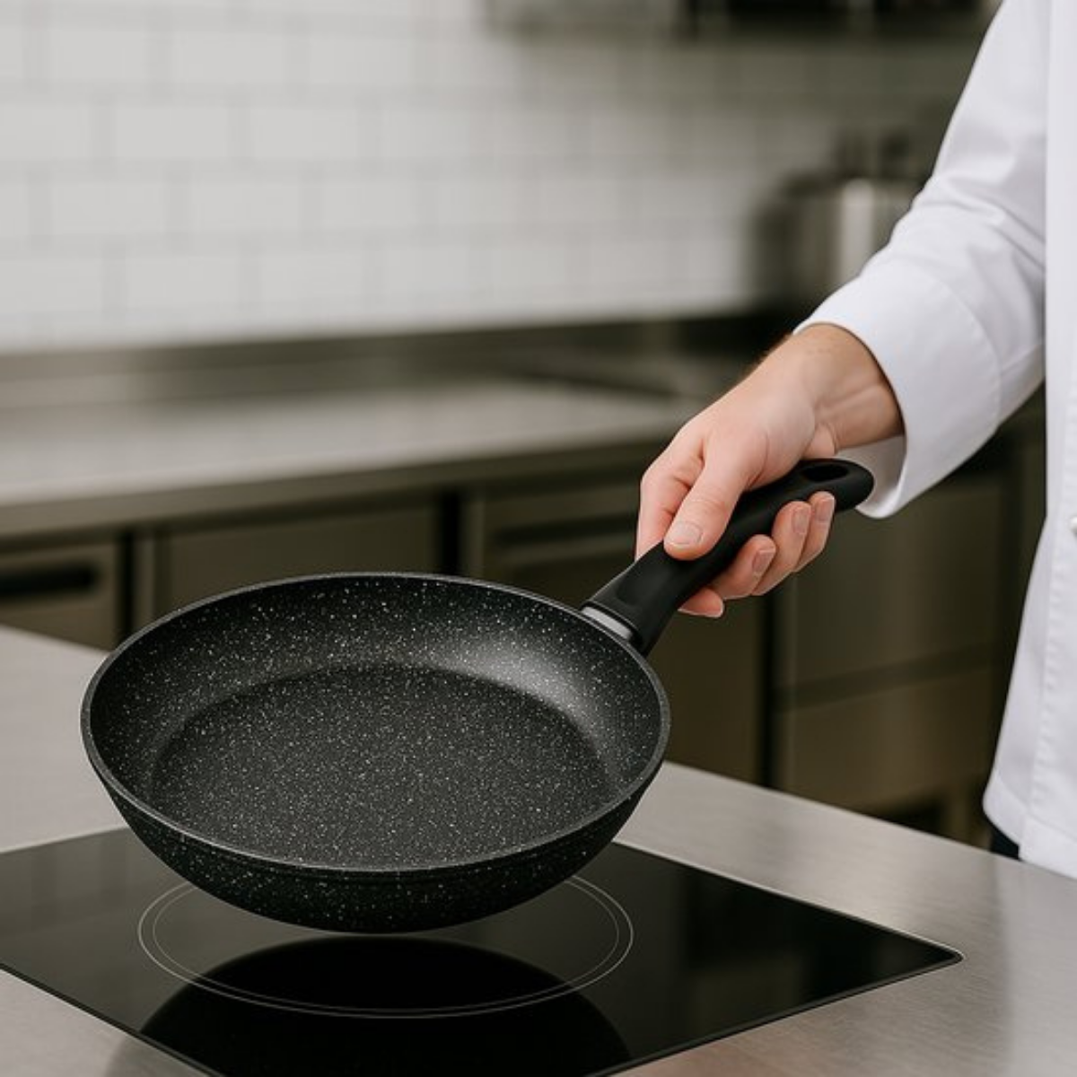 De Granite Pro koekenpan springt eruit door zijn unieke coating: kijk goed en je ziet de titaniumdeeltjes die de keramische laag versterken. Dat maakt hem extra duurzaam en perfect voor intensief gebruik. Met 4 mm dik aluminium voor gelijkmatige warmte, een soft-touch handvat.