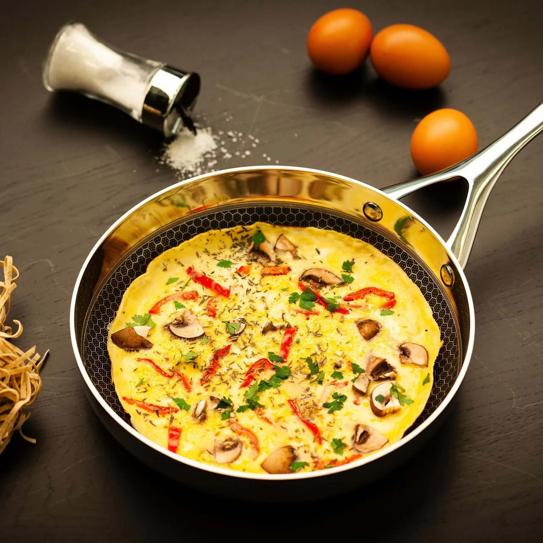 Onze pannen gebruiken tot 90% minder olie. Voor extra smaak mag je natuurlijk altijd wat toevoegen.